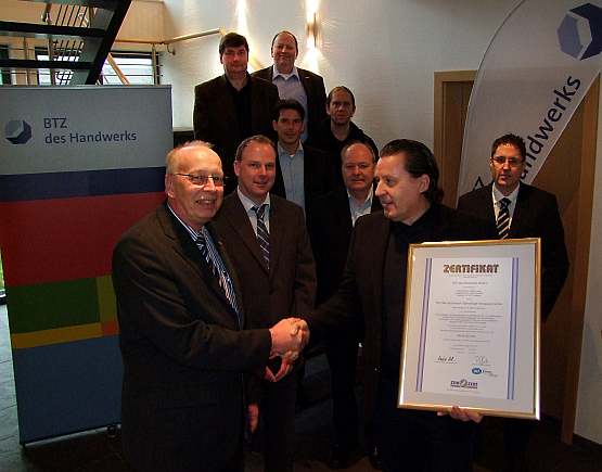 Erfreut nehmen Tilman Stürmer (links) und Heinz Jansen (2. von links) aus den Händen von Peter Löpp die neuen Urkunden über die erfolgreichen Zertifizierungen entgegen. Mit dabei sind die zuständigen QM-Beauftragten sowie Mitglieder der BTZ-Geschäftsführung.